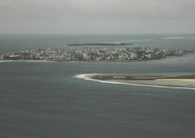 Voici l’arrivée aux Maldives sur l’île-aéroport international Hulhule, après avoir survolé l’île-capitale du pays : Malé. Les îles sont agrandies afin d’augmenter leur capacité de stockage pour l’approvisionnement des îles-hôtels. Décollage…
